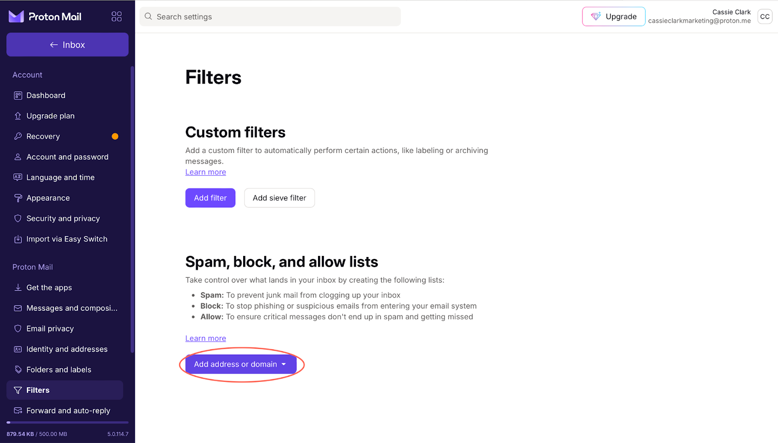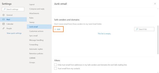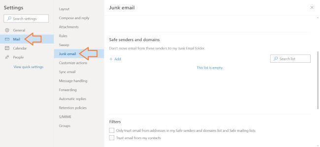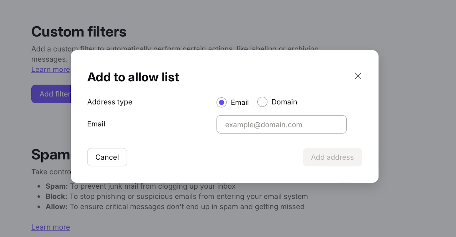 Depending on my selection, I can enter the email address or domain in the field box.